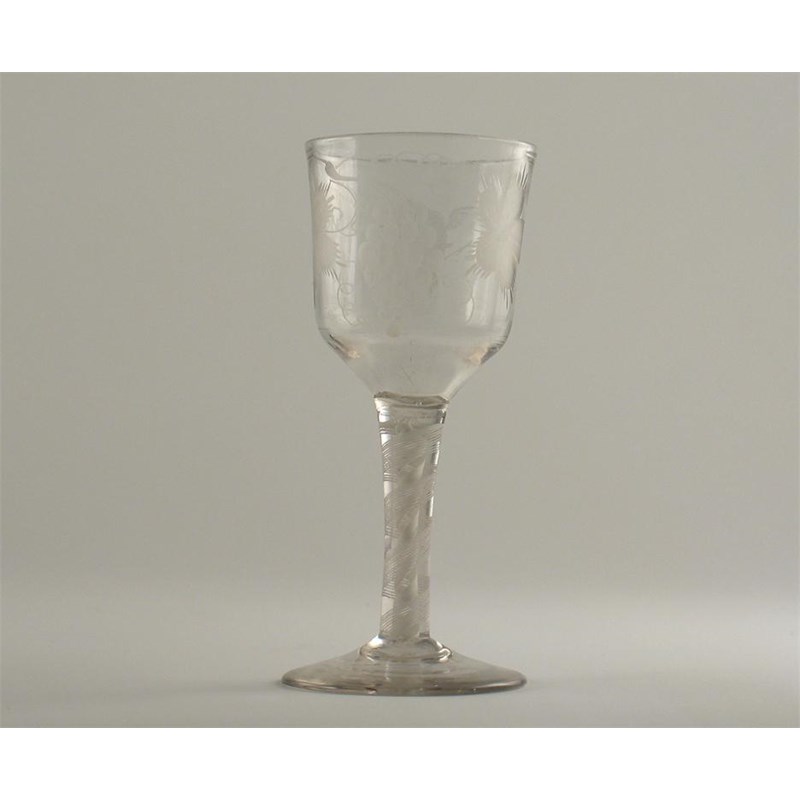 A wine goblet, the bowl engraved with a bird to one side, and with grapes on a vine to the other, an opaque twist stem, c.1770, 18.5cm.