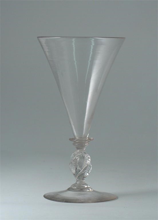 A wine glass with a conical bowl, above a flattened knop and a propeller stem, probably 18th century Venice, 17.5cm.