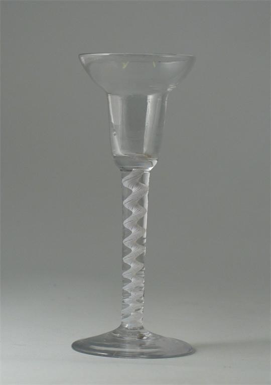A pan-topped wine glass, on an opaque corkscrew twist stem, c.1765, 15.7cm.