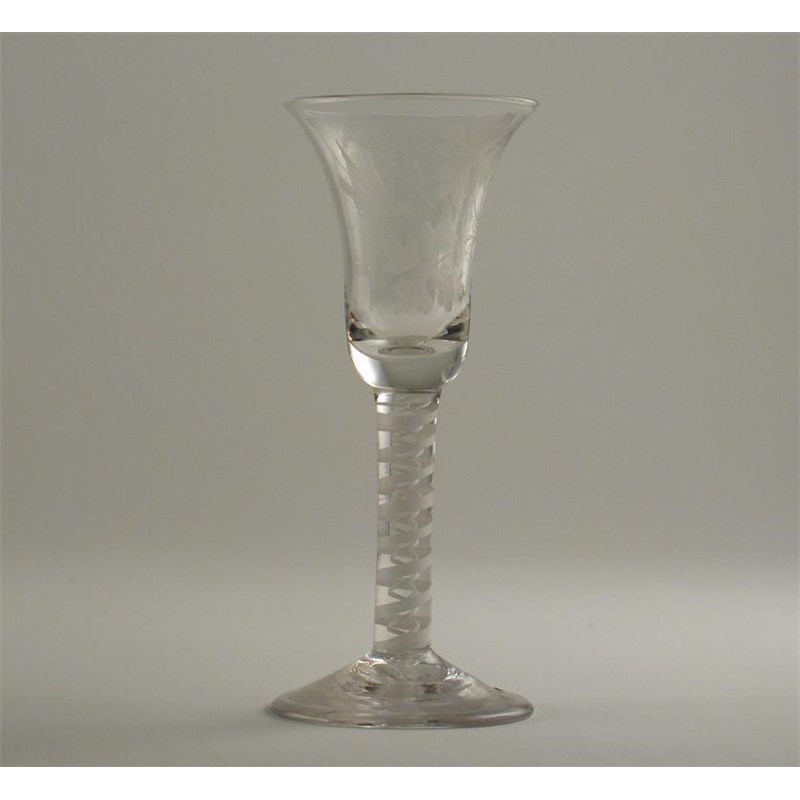A wine glass with trumpet bowl, engraved with a bird and grapevine, on a double opaque twist stem, c.1770, 15.8cm.