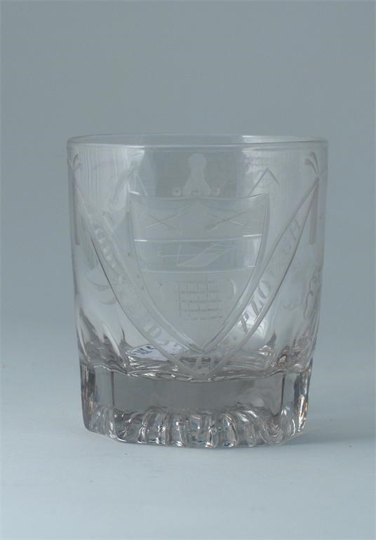 A glass tumbler, attributed to William Absolon, with an octagonal-moulded and lemon squeezer base, the sides engraved with a shield and the motto 'God Speed the Plough', the reverse with a panel inscribed 'J Star Tilney', 19th century, 9.7cm.