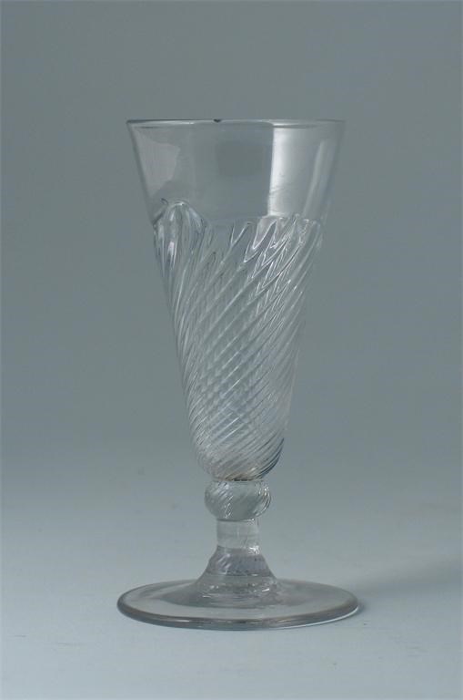 An ale glass, with a wrythen decorated bowl, on a rudimentary knopped stem, 2nd half 18th century, 12cm.