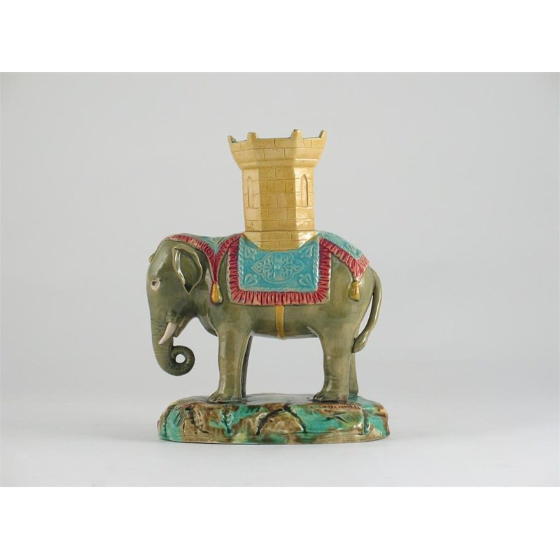 A Majolica model of an elephant, standing four square with a castle upon its back, unmarked. The base broken across the front foot and reglued. 2nd half 19th century, 19.7cm.
