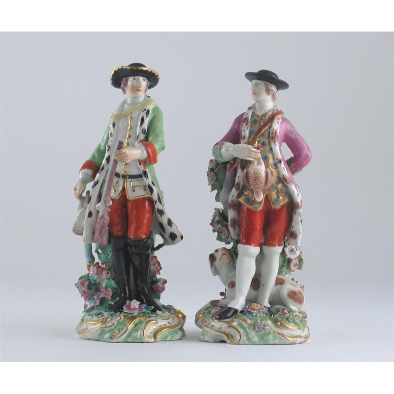 A pair of Chelsea figures of sportsmen, one holding a gun, the other holding a dead game bird with a spaniel at his feet, both on floral scrolled bases, gold anchor marks. Damages and restoration. c.1765, 21cm. (2)