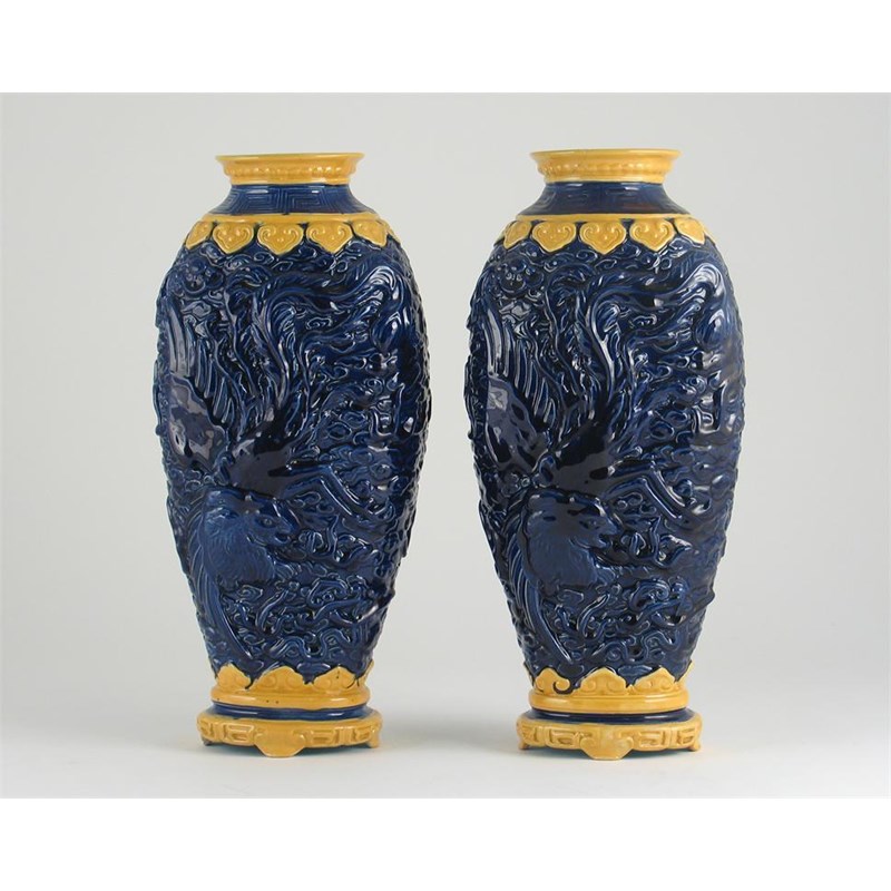 A pair of Majolica vases, moulded with Chinese dragons under a dark blue glaze. Minor faults. 19th century, 29.2cm. (2)