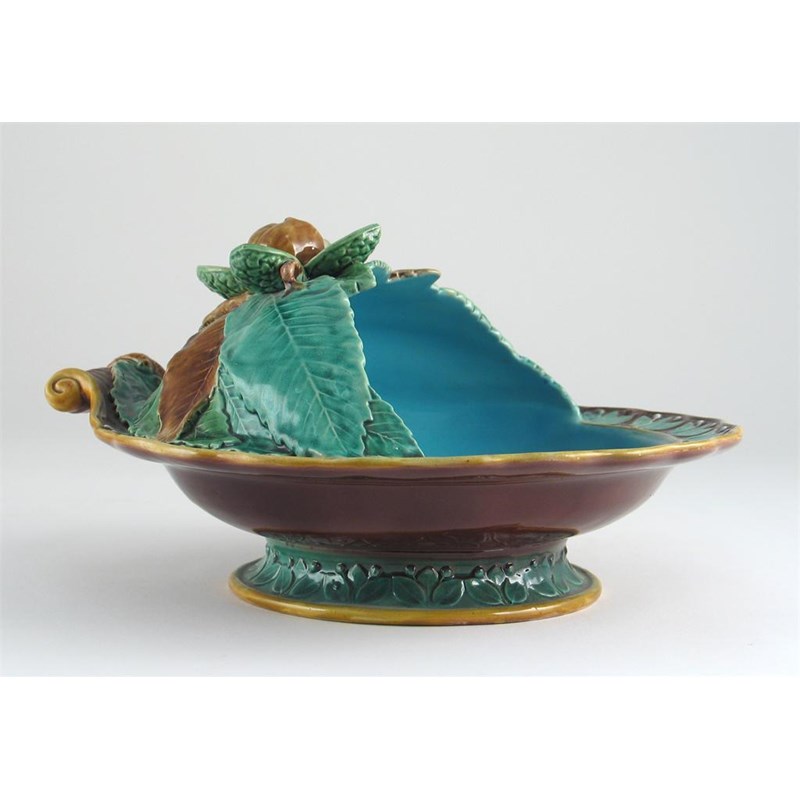 A Minton Majolica chestnut dish, with a metal fitting to the centre. Some restoration. Impressed marks and date code for 1871, 29cm. (2)