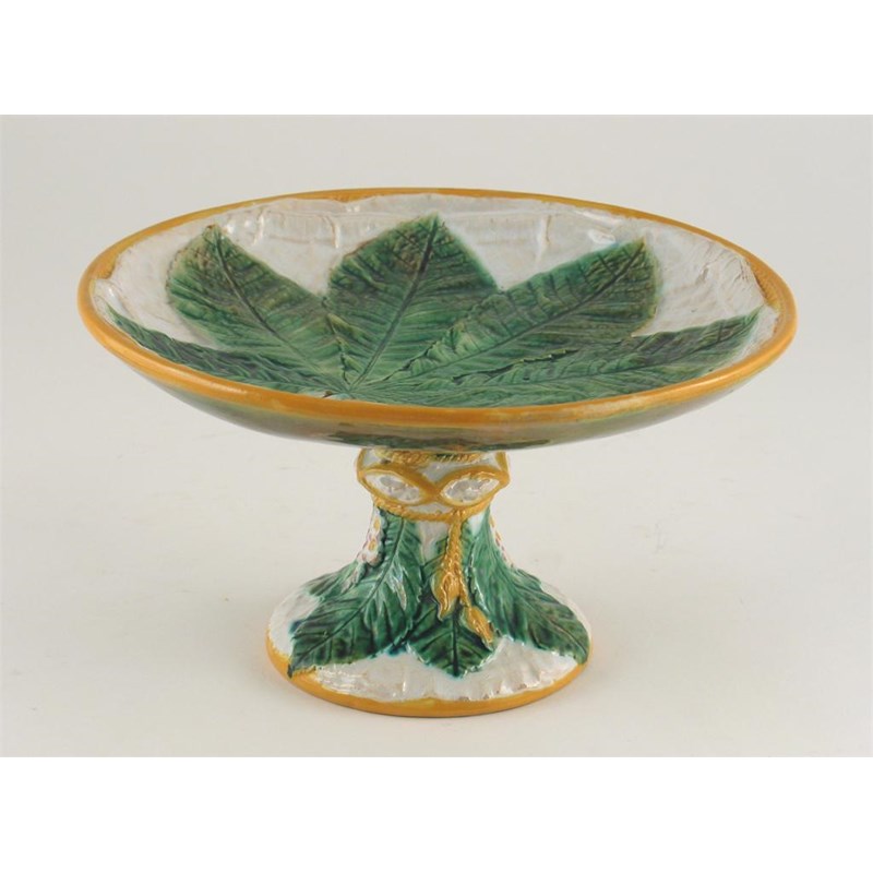 A Majolica tazza, moulded with a horse chestnut leaf, c.1870, 23cm.