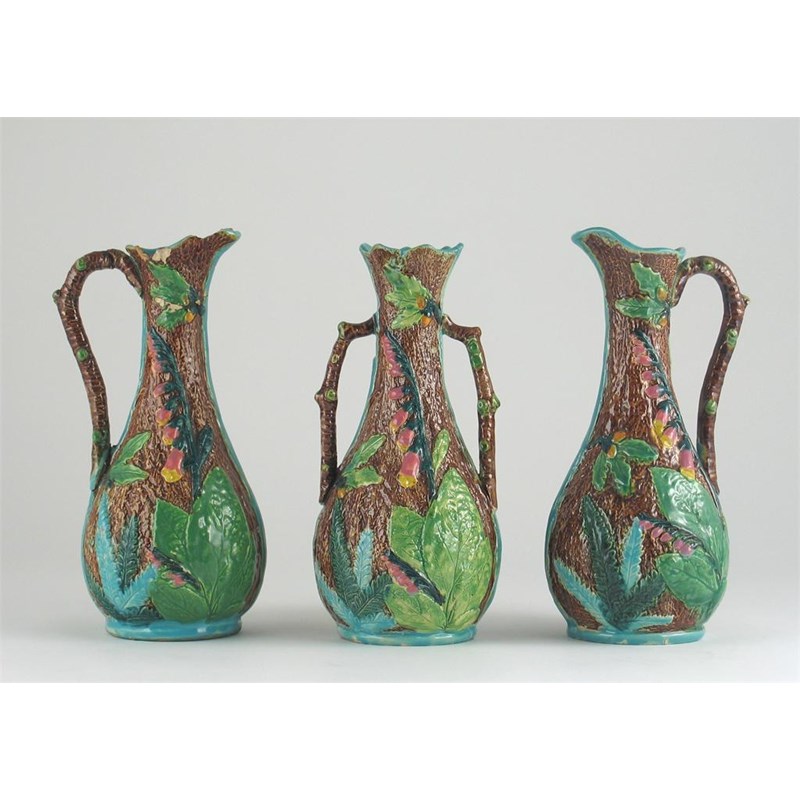 A set of two Majolica jugs and a matching vase