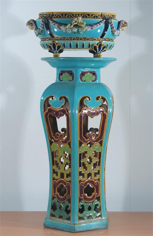 An English Majolica oval jardini?re, hung with swags upon which putti sit, impressed mark for Joseph Holdcroft. Some damages. c.1880, 50cm. Together with a large Majolica stand, 81cm. (2)