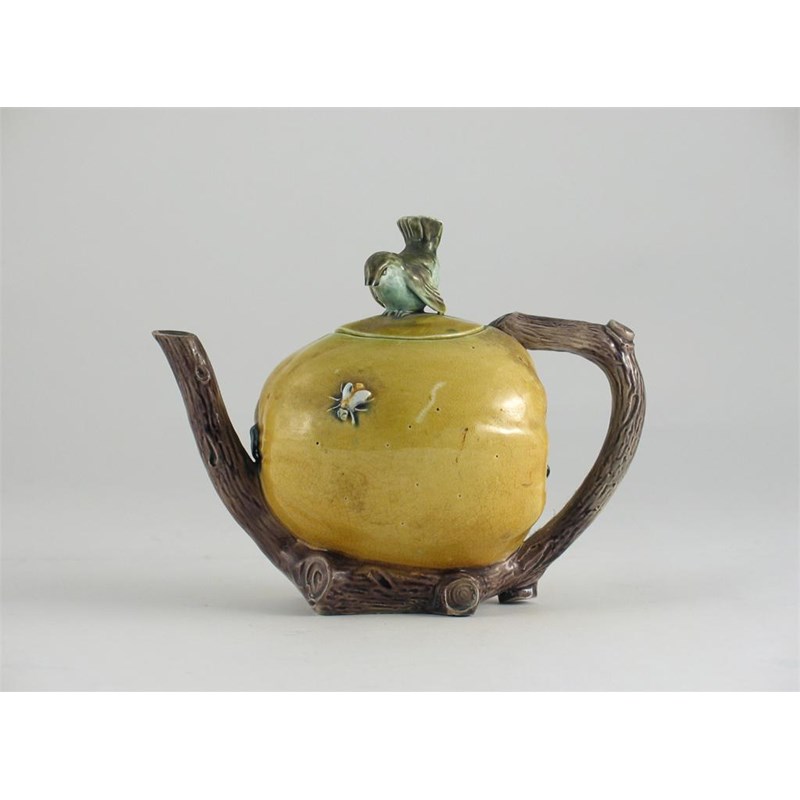 A Majolica teapot in the shape of an apple, a twig forming the handle and spout, the knop moulded as a wren watching a fly. Minor damages. 19th century, 16cm. (2) Cf. Marilyn G. Karmason and Joan B. Stacke, Majolica, p.205.