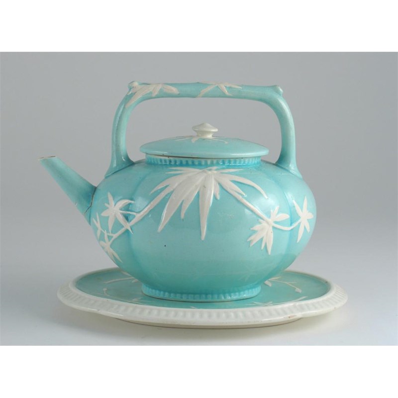 A Wedgwood quatre-lobed teapot, cover and stand, moulded with bamboo branches. Some damages. Impressed marks including date mark for 1870, 20.5cm. (3)
