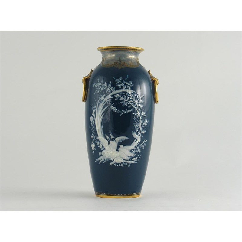 A Minton p?te-sur-p?te vase, depicting two doves, flowers and arrows, beneath a wreath of oak and reeds on a blue ground, applied gilt ring handles, impressed marks, date code for 1876, 24.3cm.