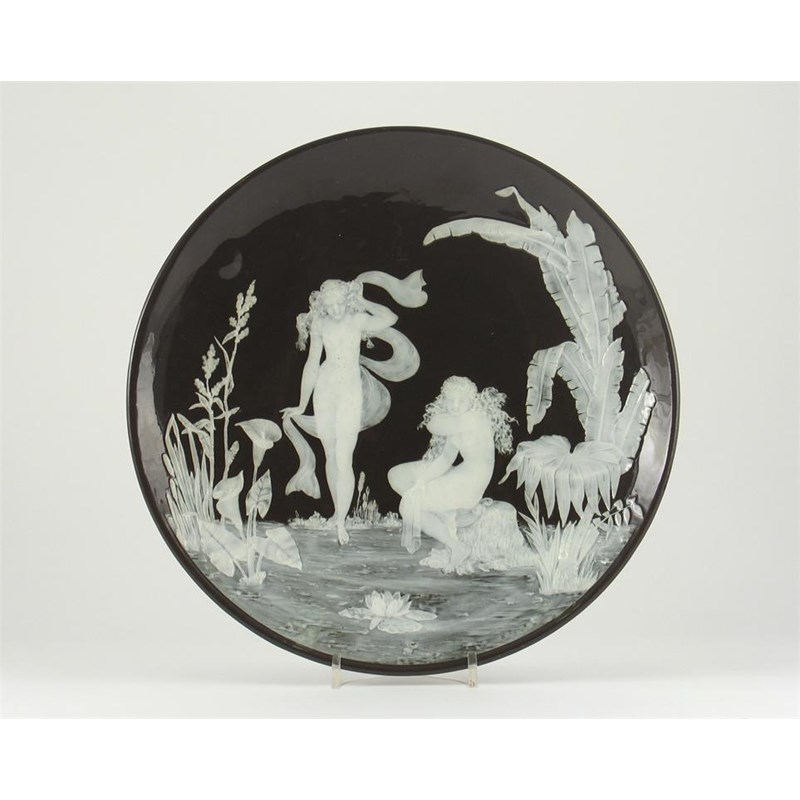A George Jones p?te-sur-p?te plaque, designed by Frederick Schenk, decorated with two young girls by a lily pond, fringed with aquatic plants, on a charcoal ground, impressed factory mark, c.1875-85, 30.7cm. Cf. Robert Cluett, George Jones Ceramics, p.163.