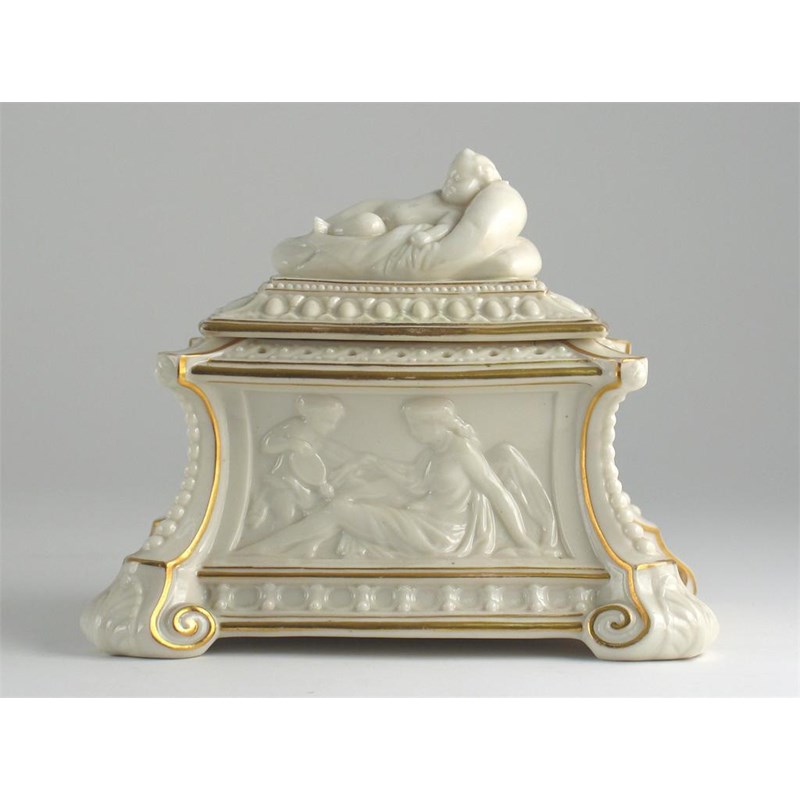 A porcelain casket and cover, perhaps Royal Worcester, the knop formed as a reclining putto, the sides moulded with figures from mythology. Some restoration to the cover. c.1880, 20cm. (2)