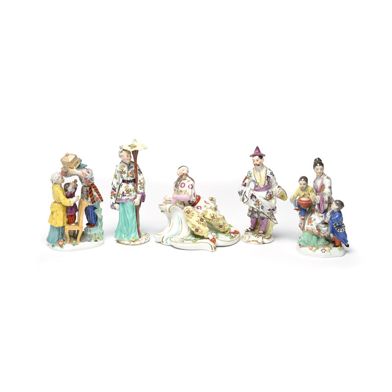 Five Continental porcelain chinoiserie figure groups, 19th and 20th centuries, two Meissen and