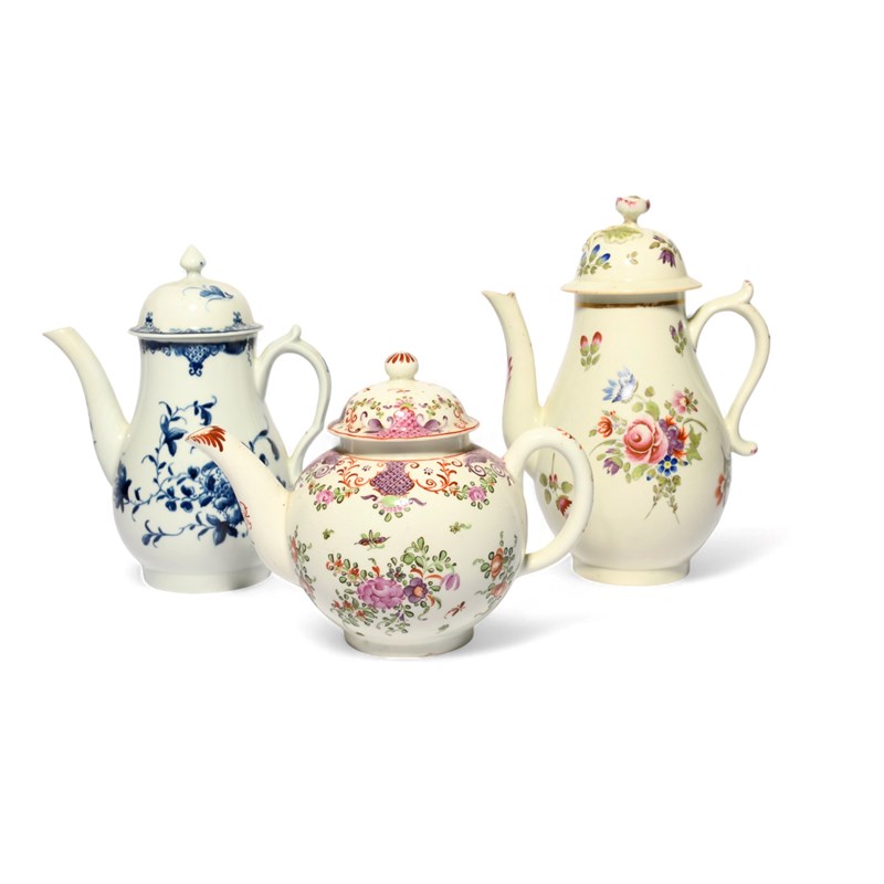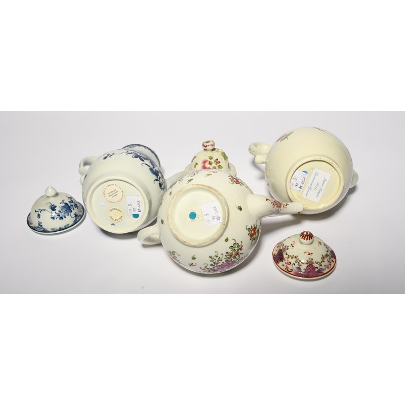 Two Worcester coffee pots and covers, c.1758-70, the smaller blue and white and painted with the Mansfield pattern, the larger painted with polychrome flower sprays, and a Lowestoft teapot and cover, painted in famille rose enamels with flowers and trellis panels in pink and purple, 21cm max (6)