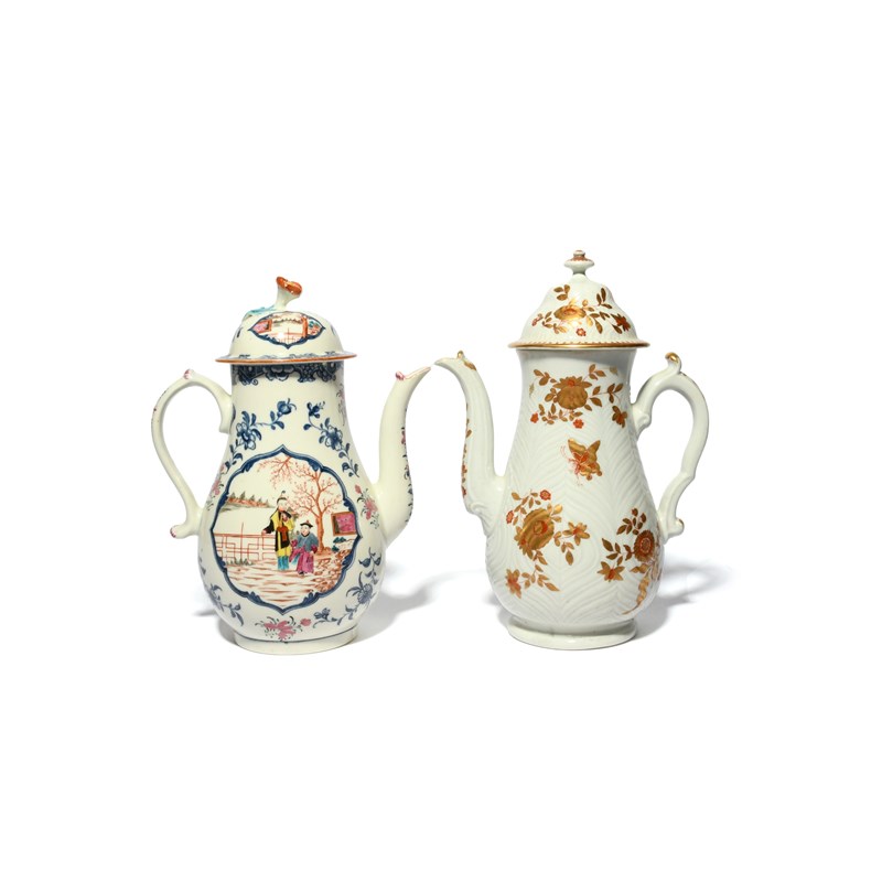 Two Worcester coffee pots and covers, c.1760-70, one feather-moulded and painted with butterflies and Oriental flower sprays in gilt and red, the other painted with Chinese figures in formal garden settings within underglaze blue and polychrome flower sprays, minor faults, 25cm max. (4)