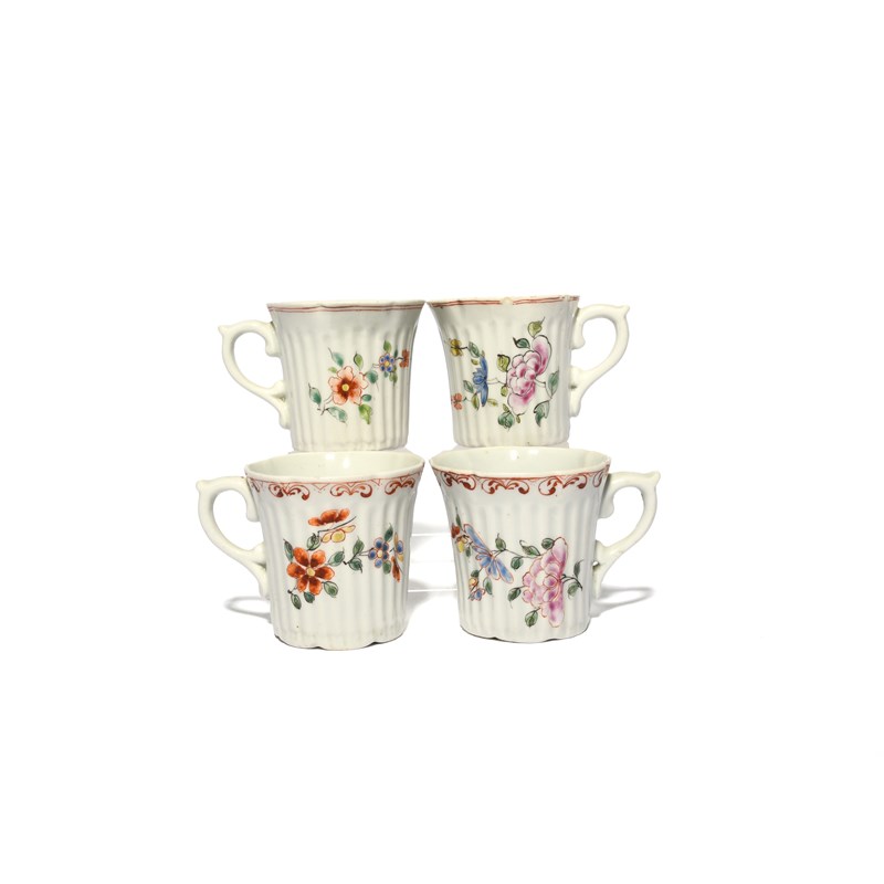 Two pairs of early Worcester coffee cups, c.1753-55, the reeded forms with lobed rims, each painted