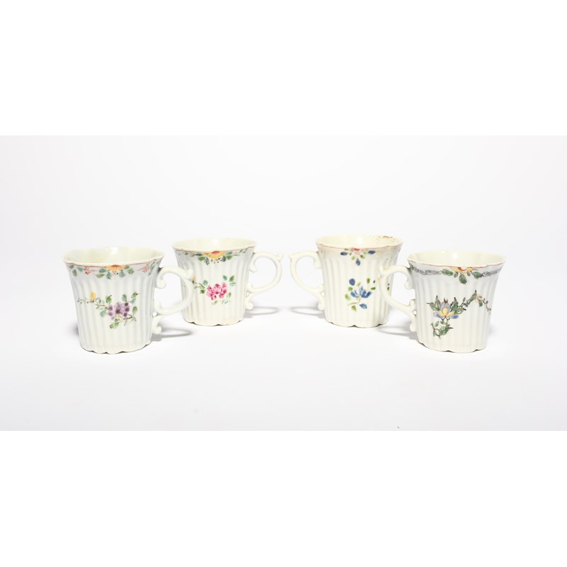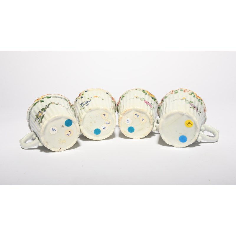 Four early Worcester coffee cups, c.1753-55, of reeded and lobed form, all similarly decorated in the famille rose palette with small flowering branches and formal floral borders, each with a scroll handle, some damages and repairs, 5.5cm. (4)