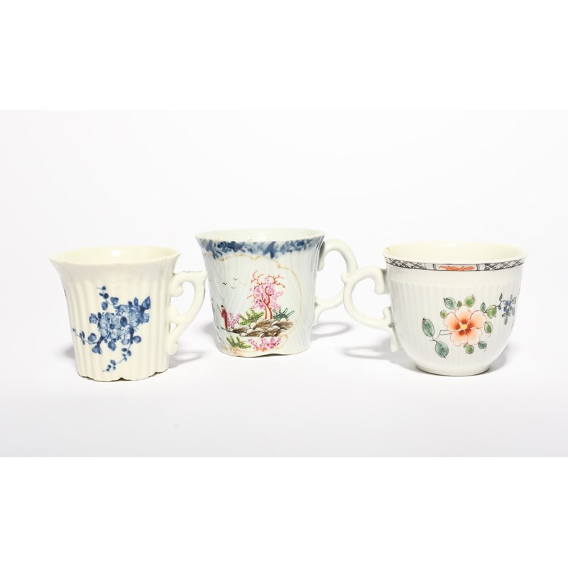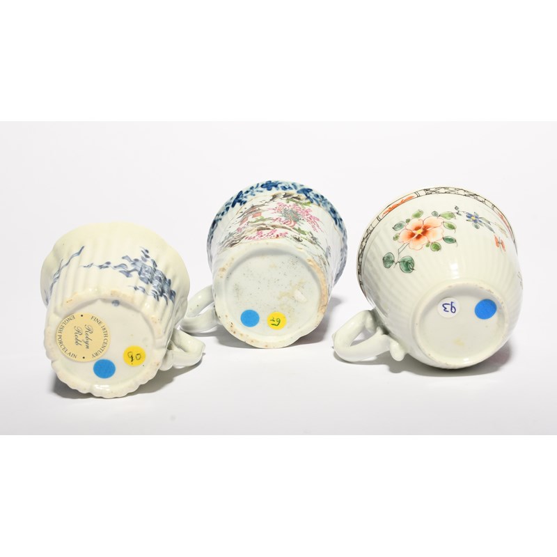 Three early Worcester coffee cups, c.1753-55, one blue and white, the reeded form painted with