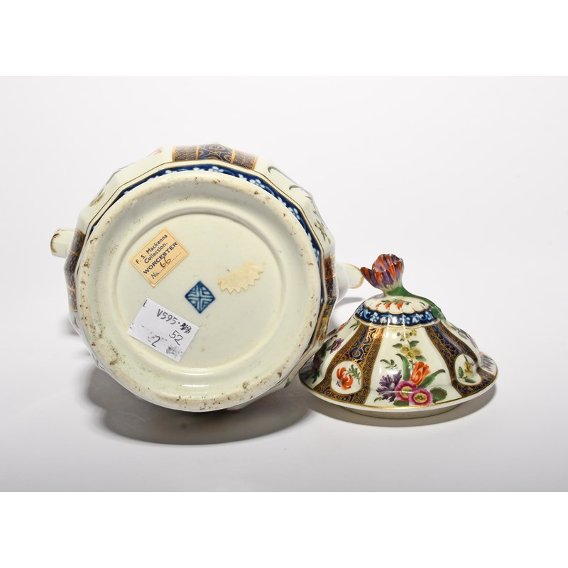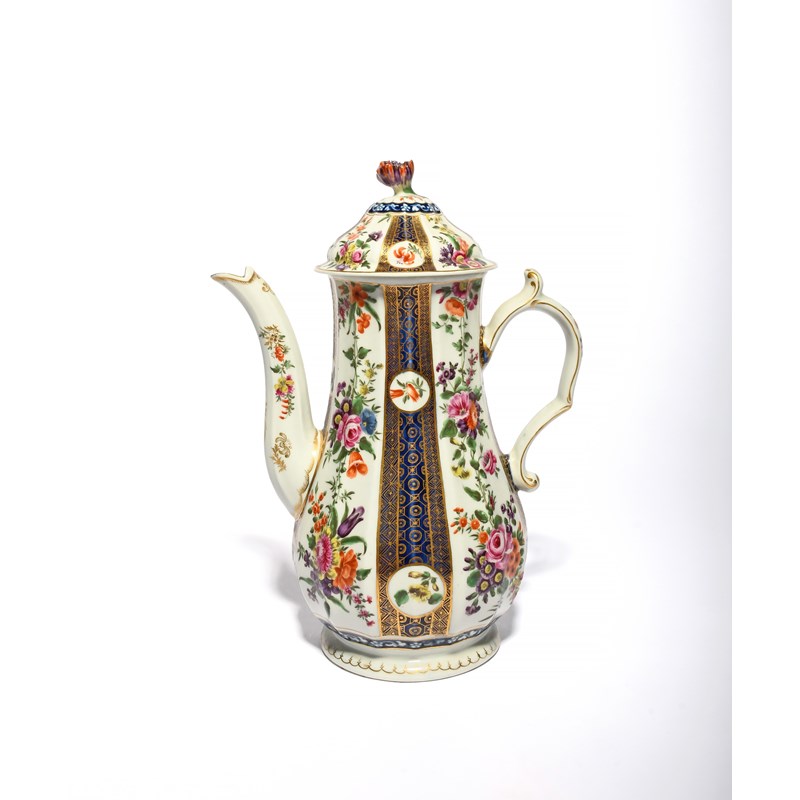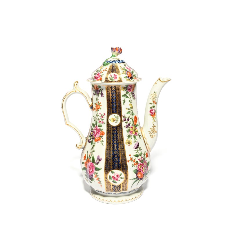 A fine Worcester coffee pot and cover, c.1765, the baluster body of Warmstry-fluted form, finely painted with polychrome flowers alternating with vertical blue bands enclosing small floral panels and highlighted with geometric gilt designs, blue square seal mark, 24.5cm. (2)