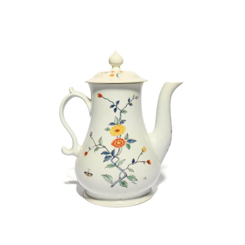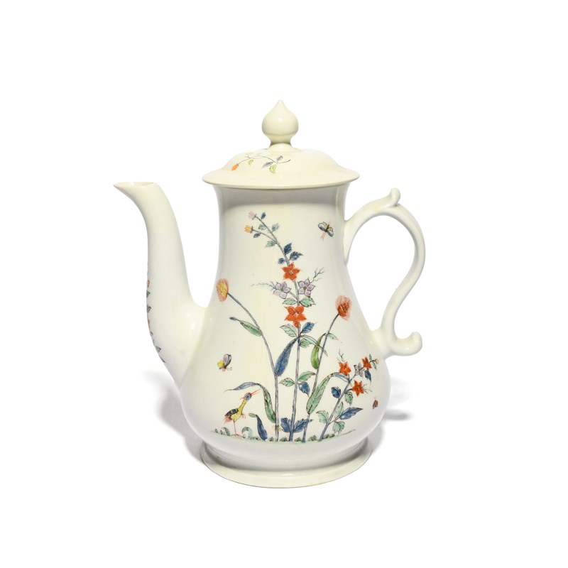 An early Worcester coffee pot and cover, c.1752-52, the squat baluster form deriving from a silver shape, painted in an extended Kakiemon palette with a small wading bird beneath tall millet sprays and flowering plants, the cover a replacement, 18cm. (2)