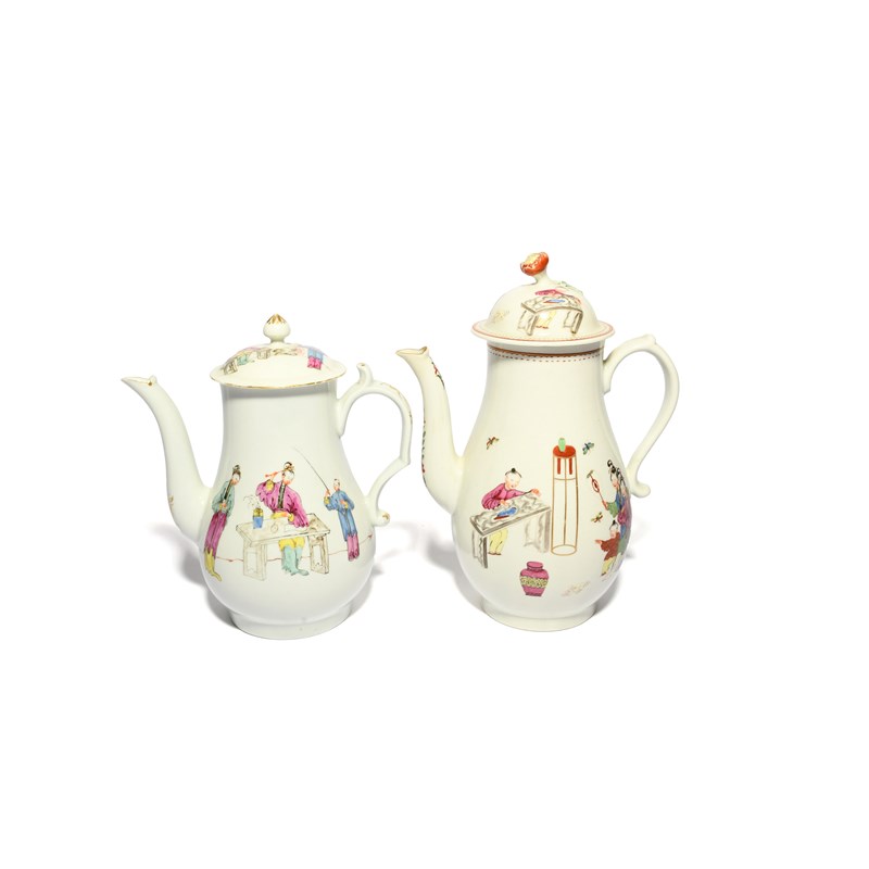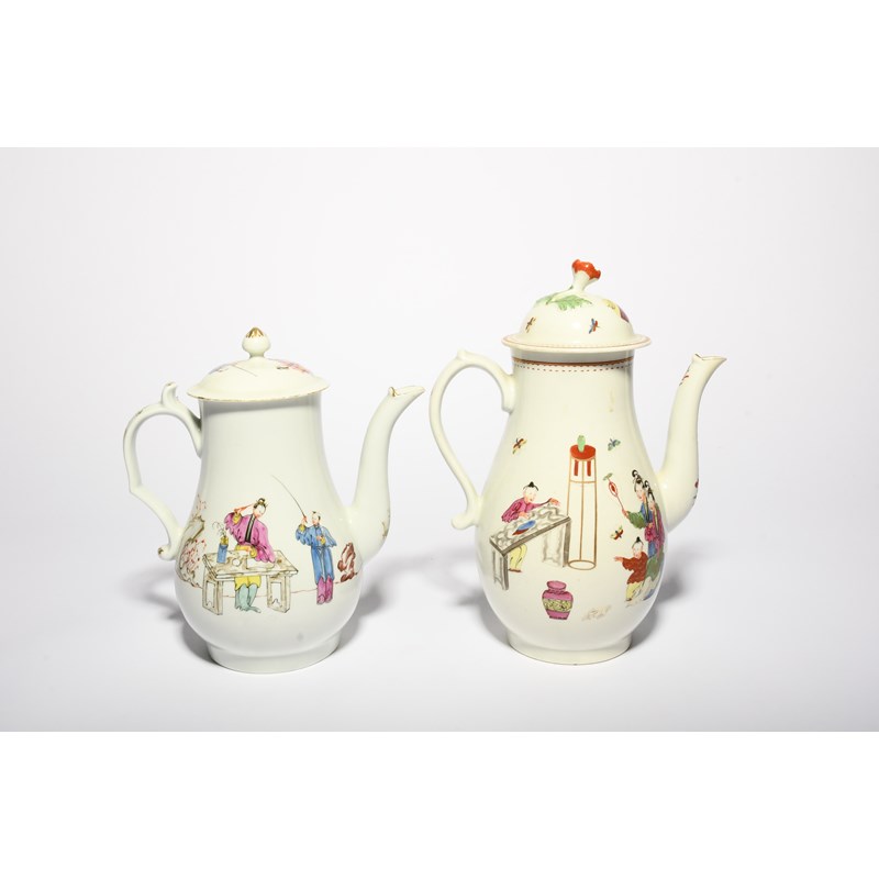 Two Worcester coffee pots and covers, c.1760-70, of varying baluster form, painted with Chinese figures seated at and standing beside tables, at various pursuits, 24.5cm max. (4)