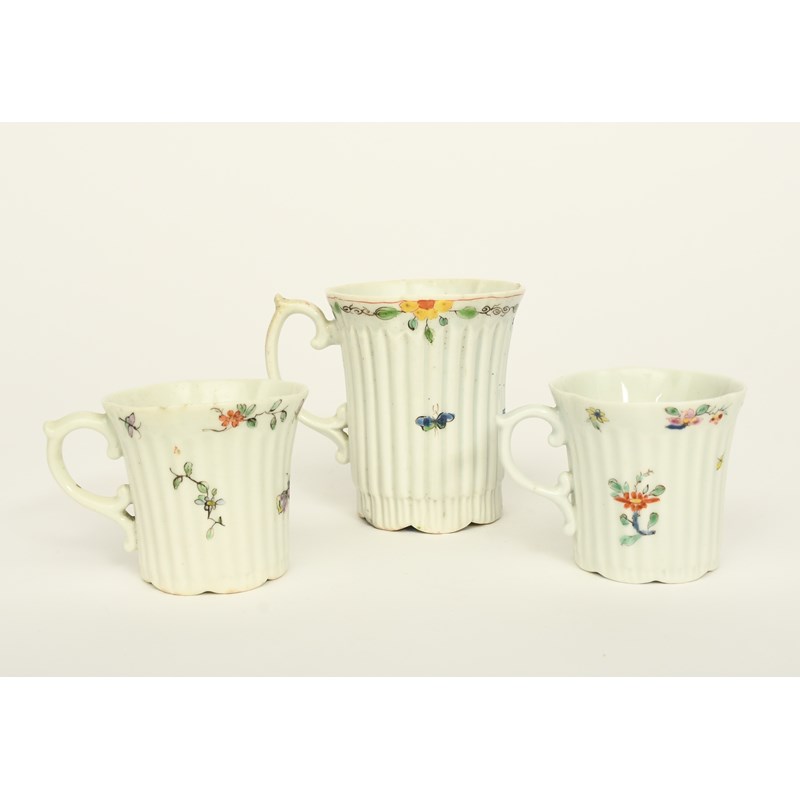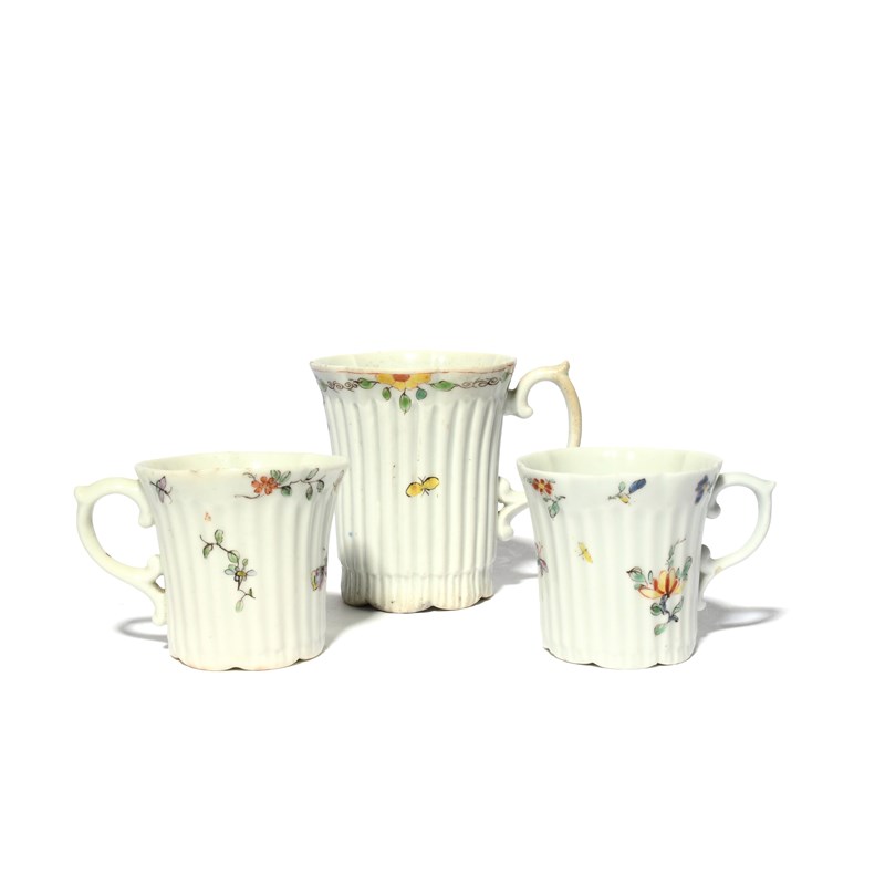 A rare and early large Worcester reeded cup, c.1753-55, the everted lobed rim painted with a border of flowerheads linked by black pencilled scrolls, the body with scattered insects, and two smaller coffee cups with similar Oriental-style decoration of scattered flower sprays and insects, minor faults, 7.7cm max. (3)