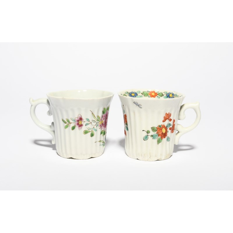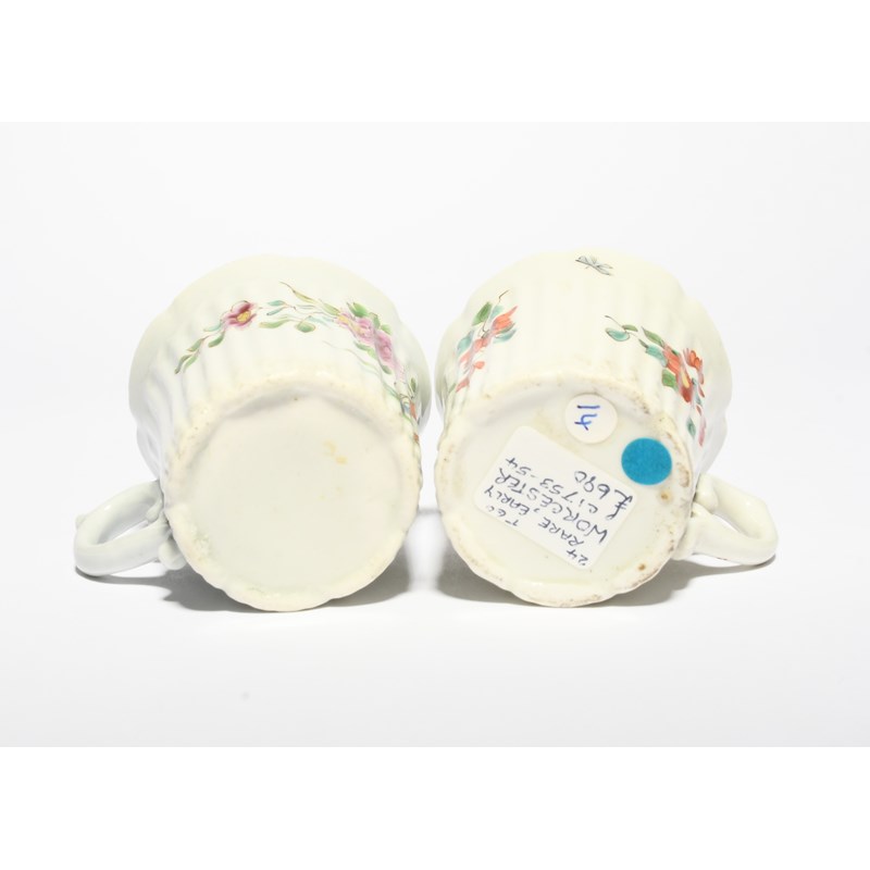 Two early Worcester coffee cups, c.1753-55, of reeded form with lobed rims, one finely painted in polychrome enamels with flowering Oriental plants issuing from rockwork, the other with small flower sprigs, the interior rim with a continuous flowerhead border, each applied with a scroll handle, 5.3cm. (2)