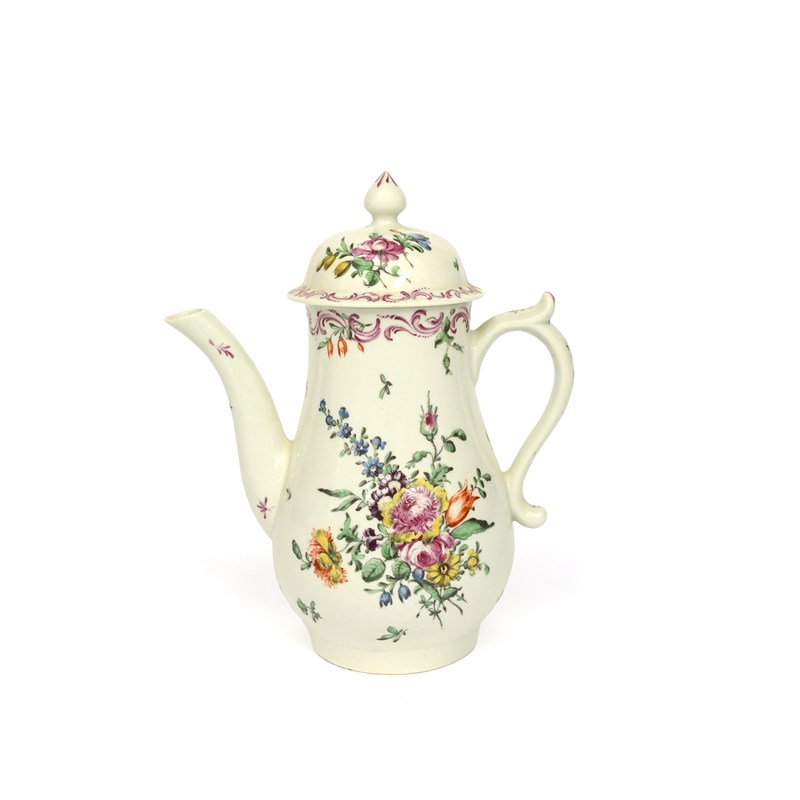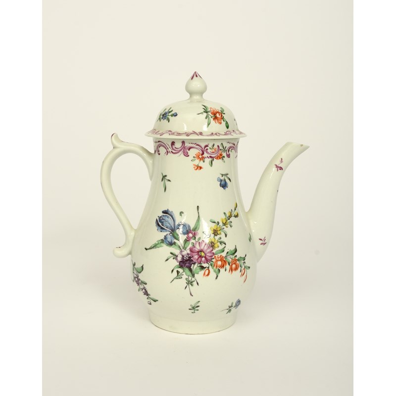 A small Worcester coffee pot and cover, c.1756-58, the baluster body painted with an arrangement of flowers amid small scattered sprigs, the rim and cover with a continuous puce scroll border, 19cm. (2)