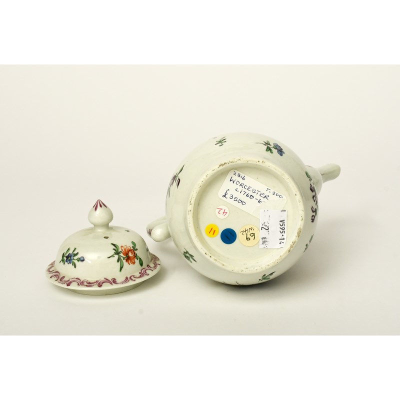 A small Worcester coffee pot and cover, c.1756-58, the baluster body painted with an arrangement of