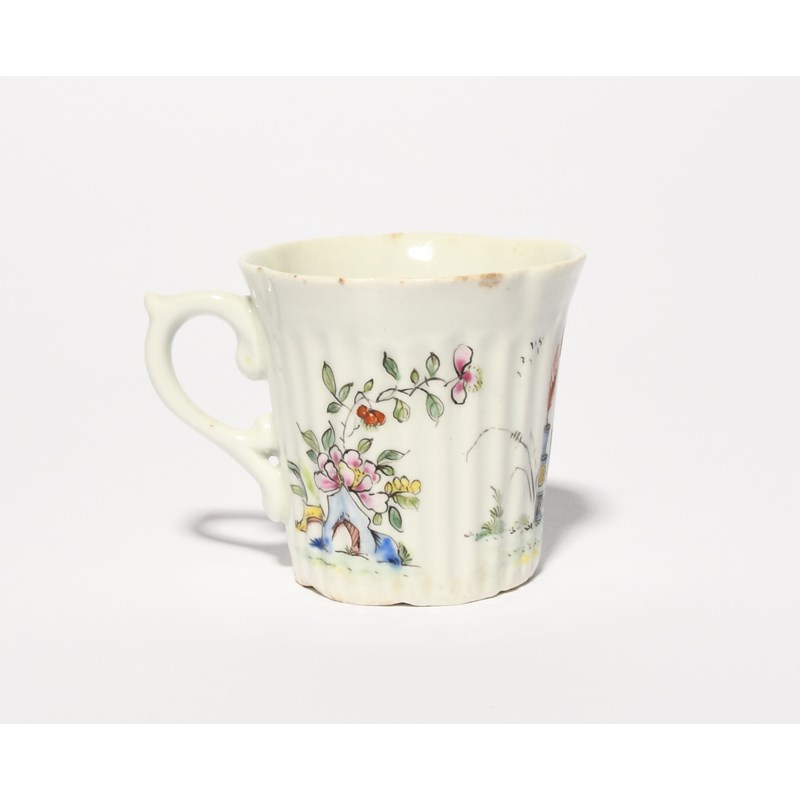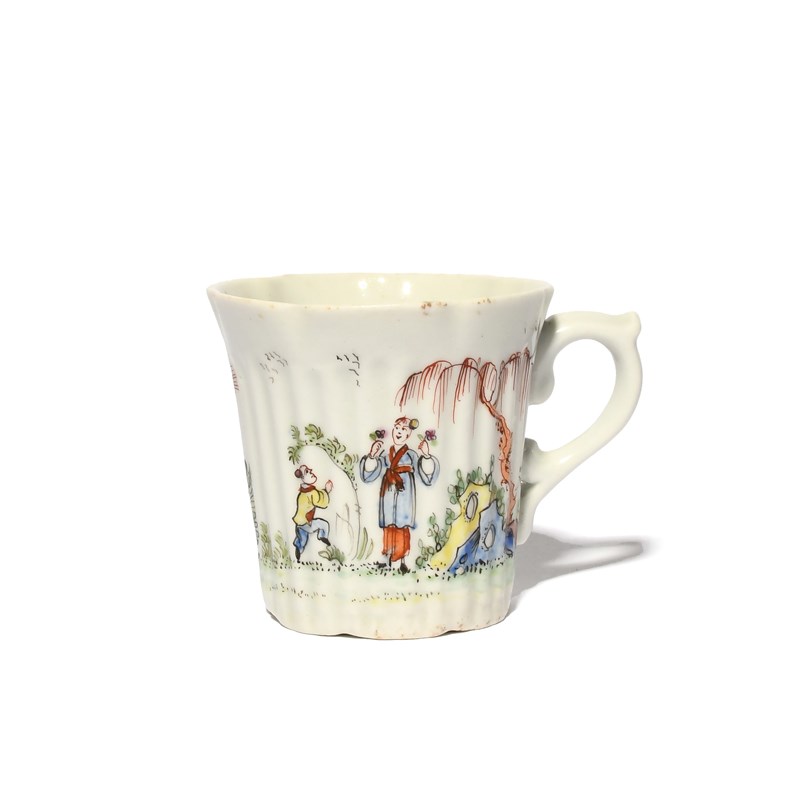 A rare and early Worcester coffee cup, c.1753-54, the reeded form well painted with a Chinese boy and a Long Eliza figure standing beneath a willow tree and a tall vase, beside the handle with a peony spray issuing from rockwork, 5.2cm.