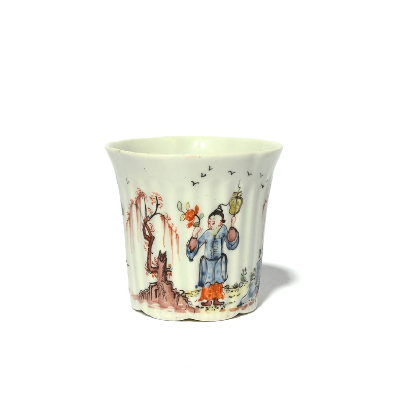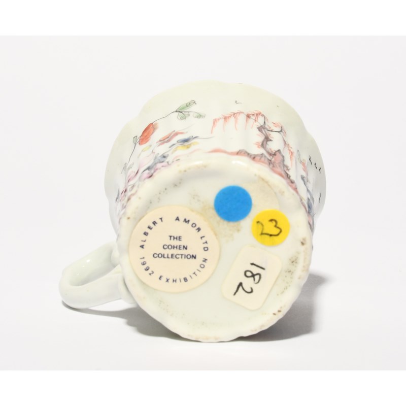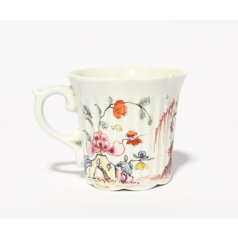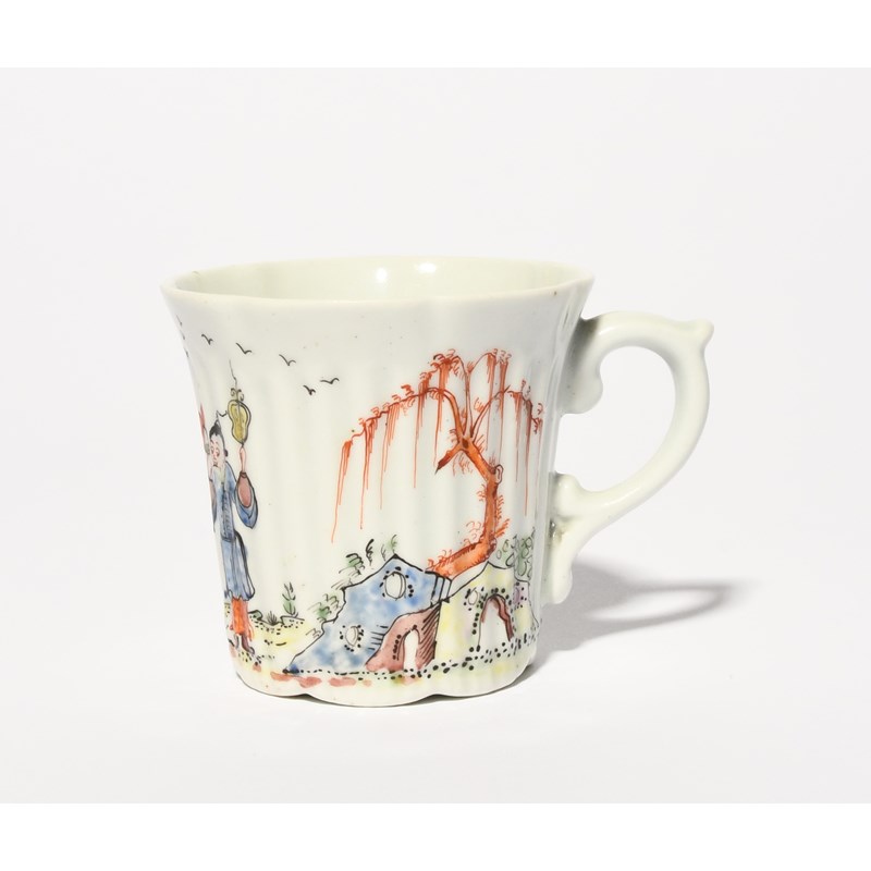 A rare early Worcester coffee cup, c.1753-54, the reeded form finely painted with a Chinese figure holding a flower spray and a fan, flanked by willow trees and beside a large spray of flowering peony, with a scroll handle, 5.2cm.