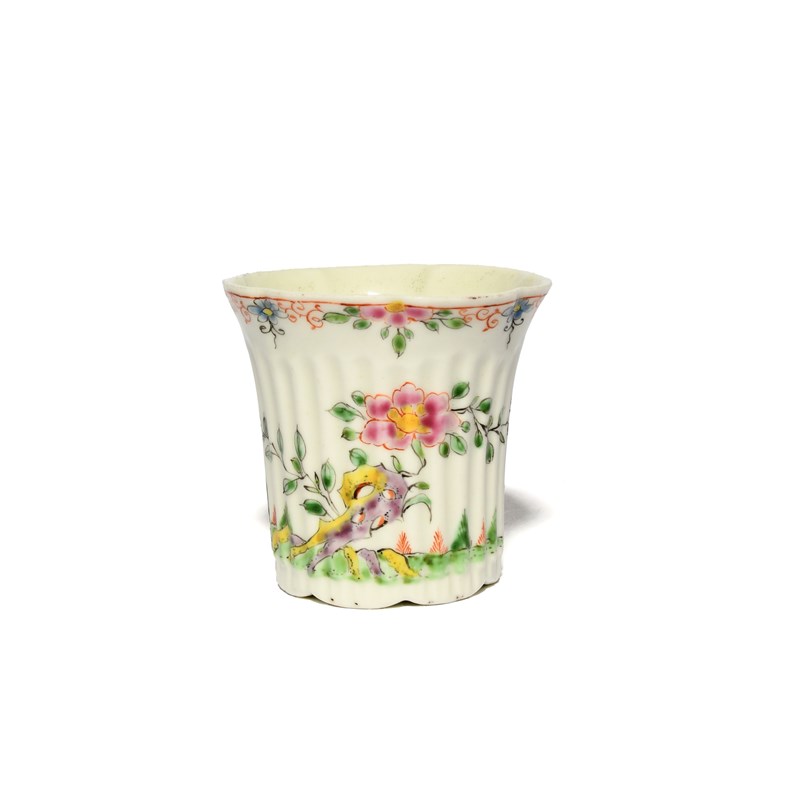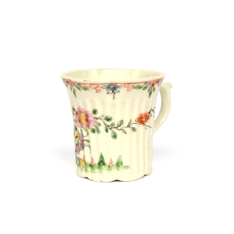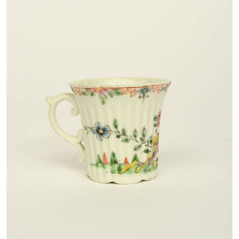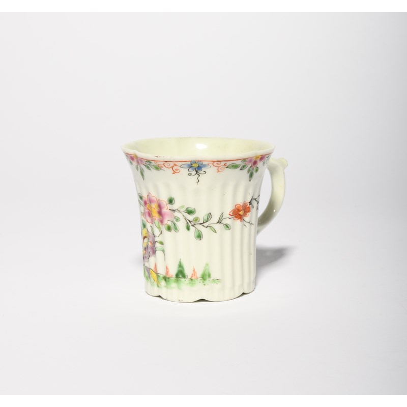 An early Worcester coffee cup, c.1753-55, the reeded form finely painted in the Oriental manner with a flowering peony tree before distant pine trees, the lobed rim with a formal flowerhead border in famille rose enamels, a small rim chip, 5.3cm.