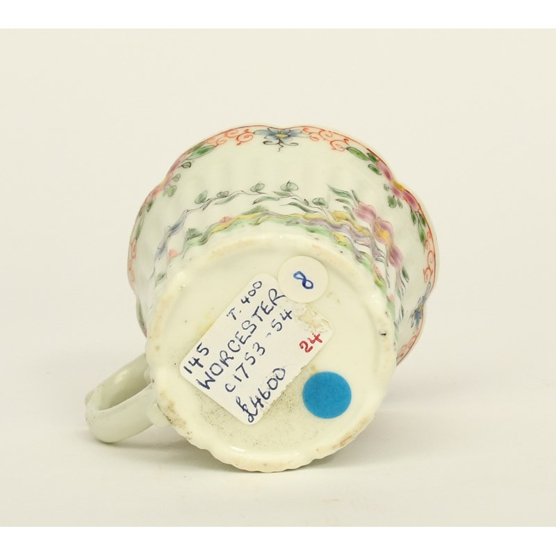 An early Worcester coffee cup, c.1753-55, the reeded form finely painted in the Oriental manner with