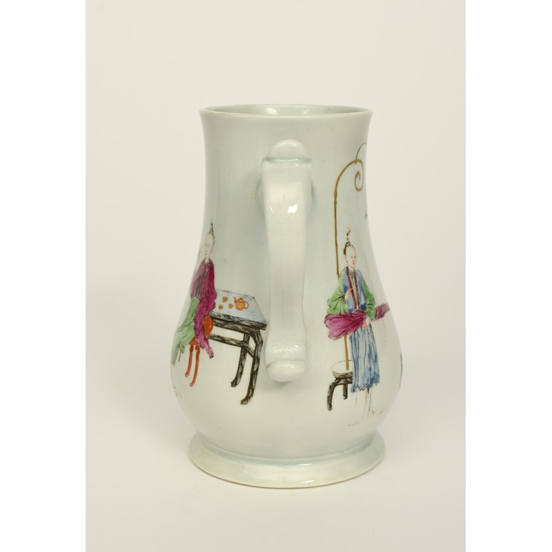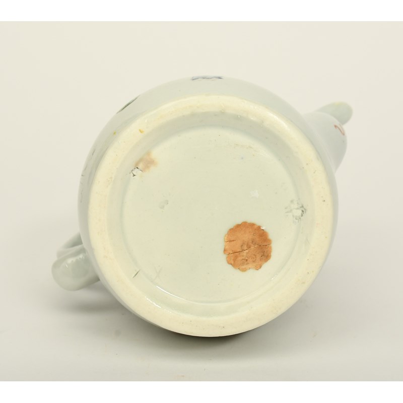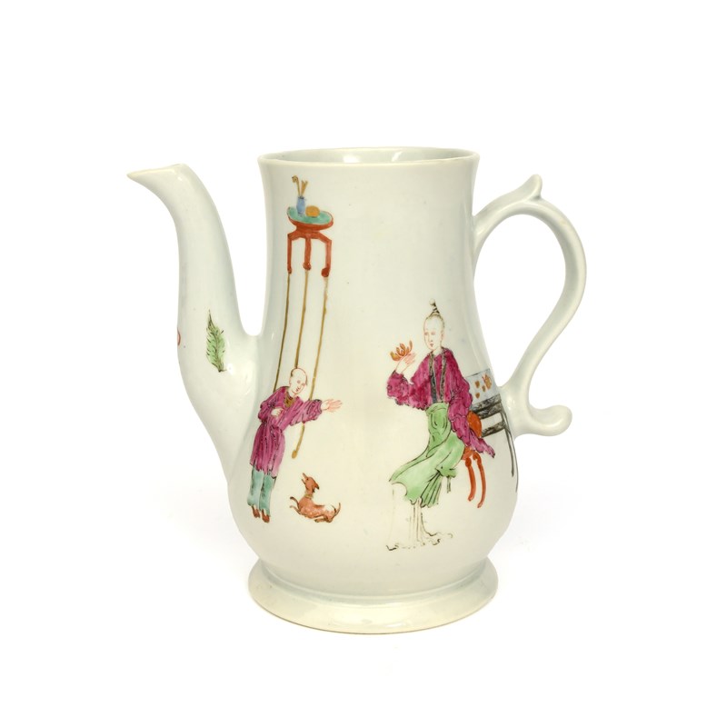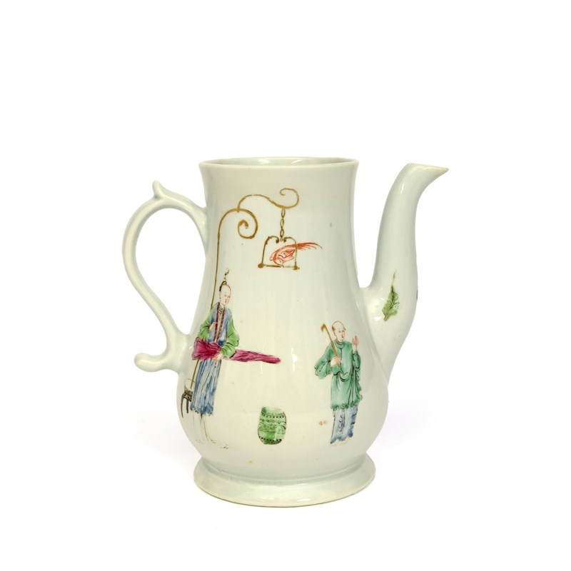 A Worcester 'Scratch Cross' coffee pot, c.1753-55, the pear-shaped body painted in polychrome enamels, one side with a Chinese boy and his dog beside his mother seated at a tea table, the reverse with two Chinese figures beneath a long-tailed bird perched on a stand, the cover lacking, some good restoration, 14cm high.