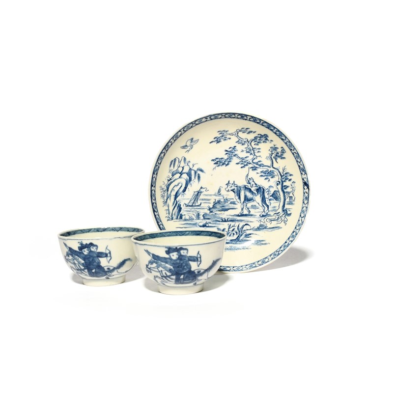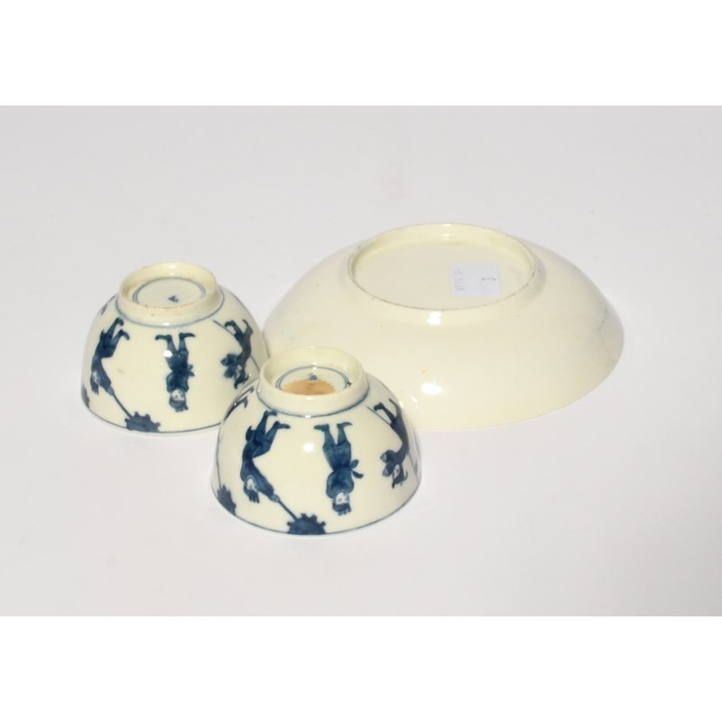 A pair of Worcester blue and white teabowls, c.1765, painted with the Eloping Bride pattern, and a Derby saucer printed with the Boy on a Buffalo pattern, 12.3cm max. (3)
