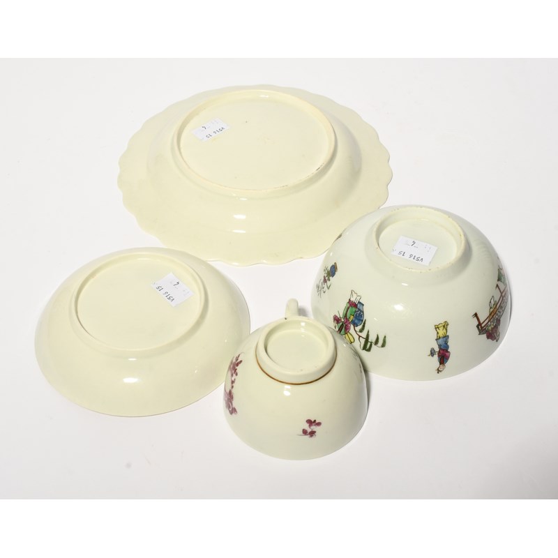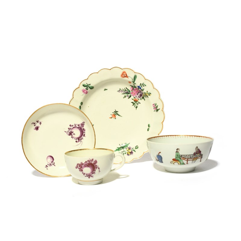 A small Worcester bowl, c.1765-70, printed and coloured with Chinese figures at various pursuits, a Worcester plate painted with sprays of flowers, and a teacup and saucer painted with fruit sprigs in puce monochrome, 19.3cm max. (4)