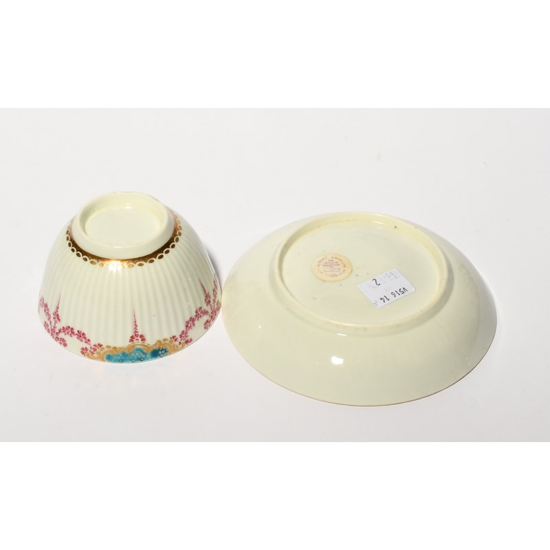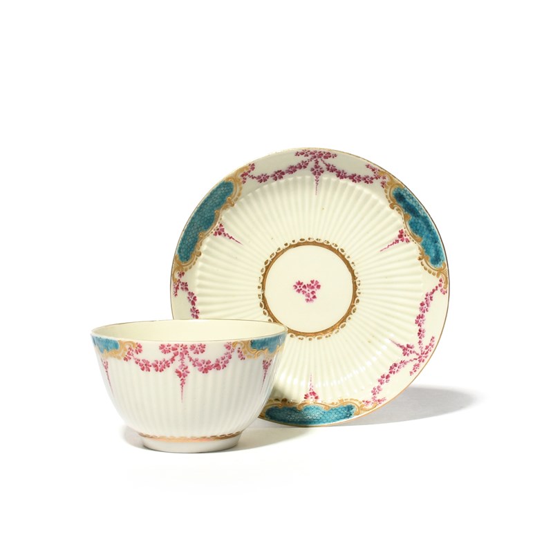 A Worcester teabowl and saucer, c.1770-75, with a fine band of reeding, painted with shaped panels of turquoise shagreen linked by puce floral swags, 13cm. (2)