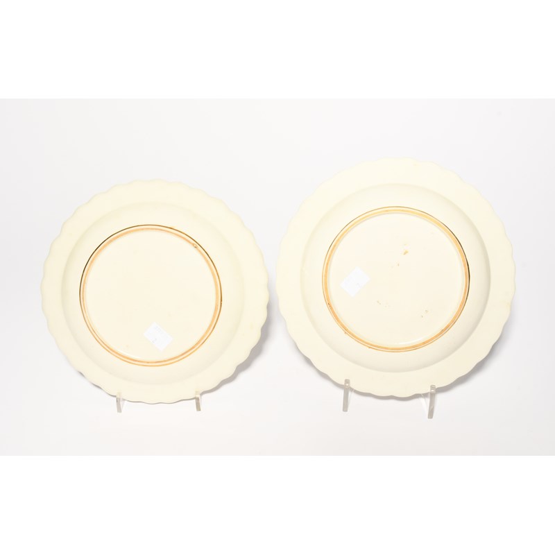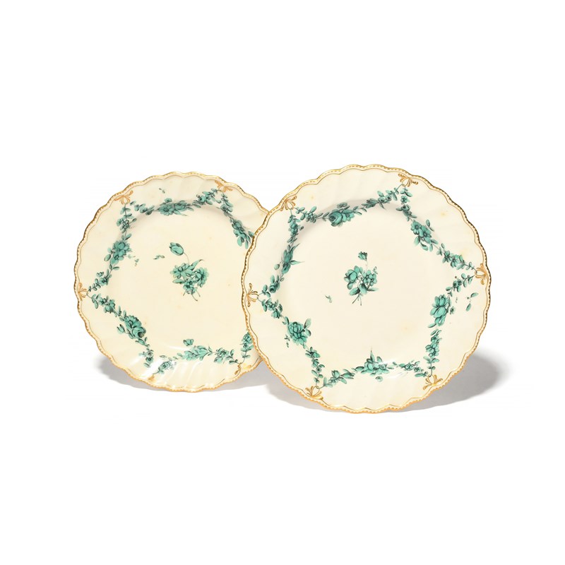 A pair of Chelsea-Derby plates, c.1770, painted in green and black with a central flower spray within garlands suspended from gilt ribbon, with spiral moulded rims, 21.2cm. (2)