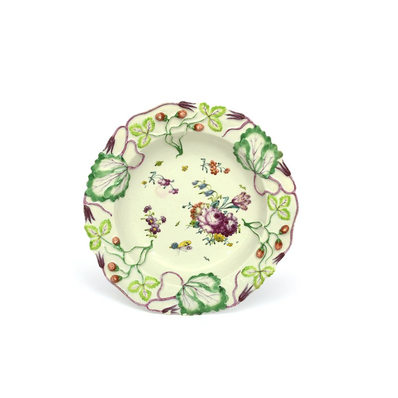A Longton Hall strawberry soup plate or shallow bowl, c.1756, the rim moulded and painted with large strawberry leaves and small fruits, the well painted with sprays of flowers and a large insect, 23.7cm.