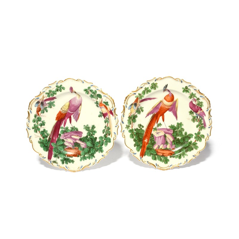 A pair of Chelsea dessert plates, c.1760-65, boldly painted in the manner of James Giles with long-tailed fancy birds perched on rockwork amid leafy plants, flanked by further colourful birds, the moulded rims picked out in blue and gilt, gold anchor marks, 22.3cm. (2)