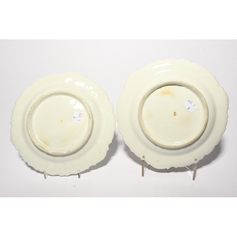 A pair of Chelsea dessert plates, c.1760-65, boldly painted in the manner of James Giles with