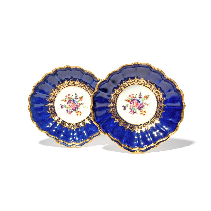 A pair of Worcester dessert plates, c.1770, of lobed shell shape, each painted with a central flower arrangement to the well, within a formal gilt scroll border reserved on a wet blue ground, blue crescent marks, 21cm. (2)