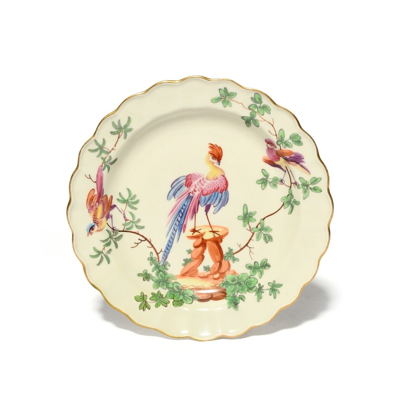 A small Worcester scallop-edged plate, c.1770-75, painted in the London atelier of James Giles with a dishevelled fancy bird standing on rockwork and flanked by two smaller birds perched in leafy branches, some restoration to the rim, 19.2cm.