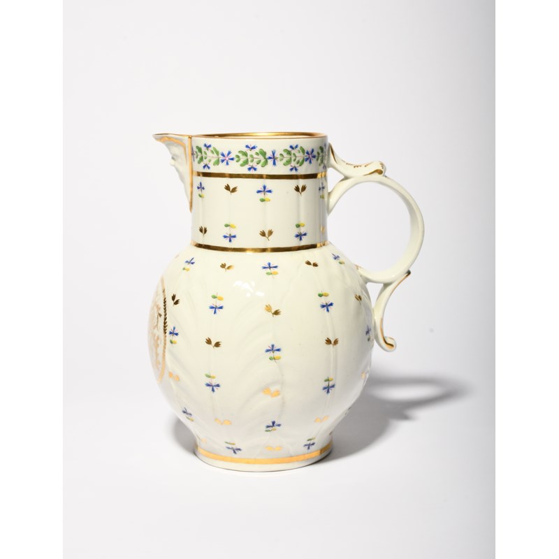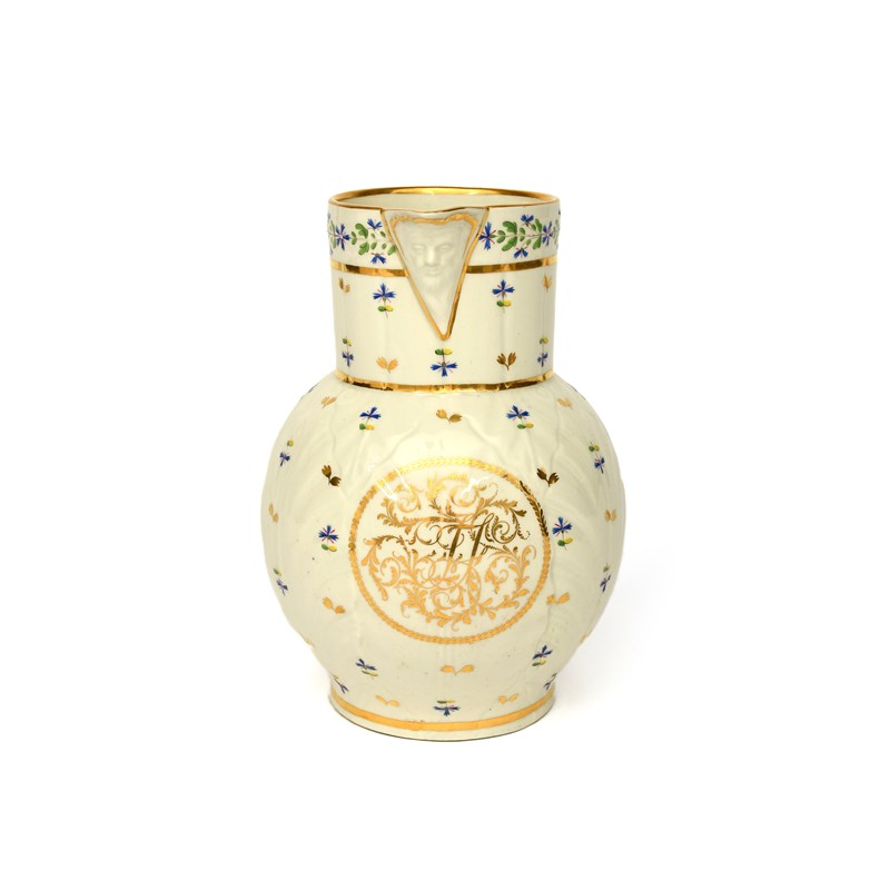 A Caughley cabbage leaf jug, 1780-90, decorated with a gilt monogram below the spout, the moulded
