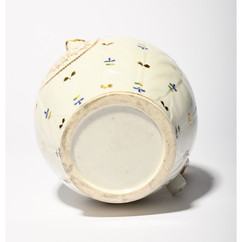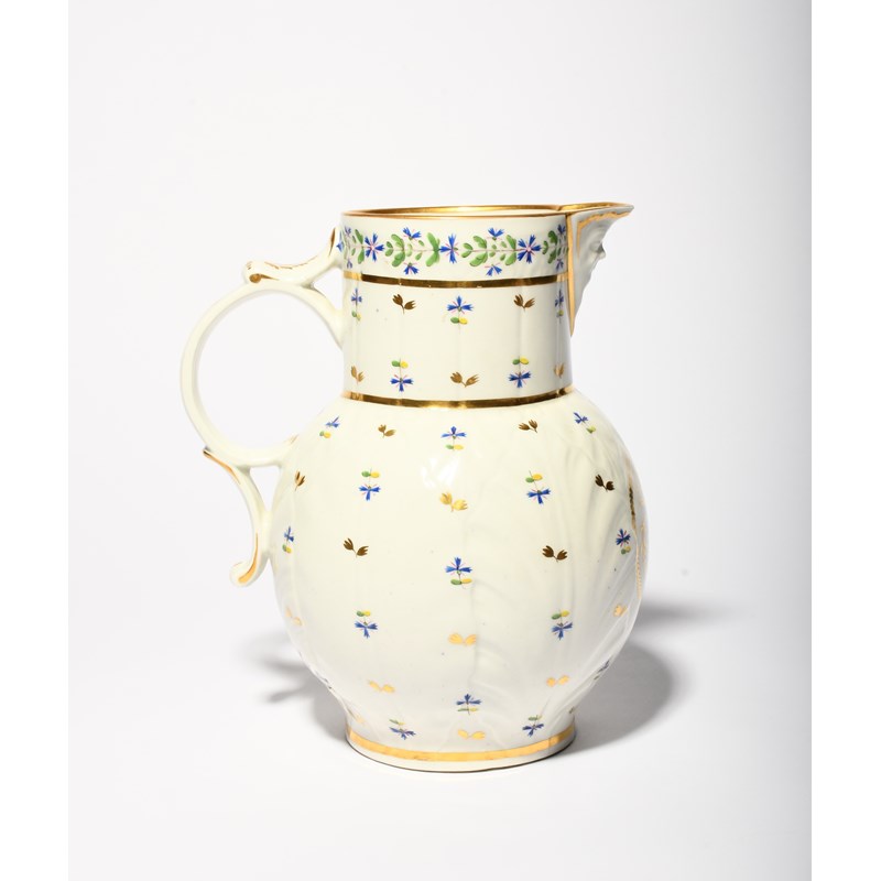 A Caughley cabbage leaf jug, 1780-90, decorated with a gilt monogram below the spout, the moulded sides decorated with gilt sprigs and blue cornflowers, the spout formed as a bearded mask, 22cm.