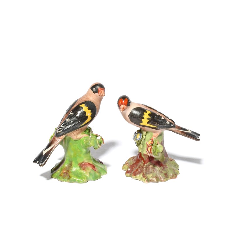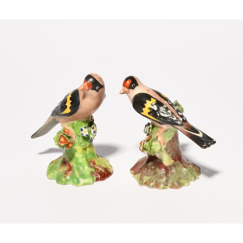 A pair of miniature Derby figures of goldfinches, c.1760-65, perched on stumps applied with flowers and leaves, naturalistically modelled and coloured as a male and female, with heads turned, some good restoration, 6cm. (2)