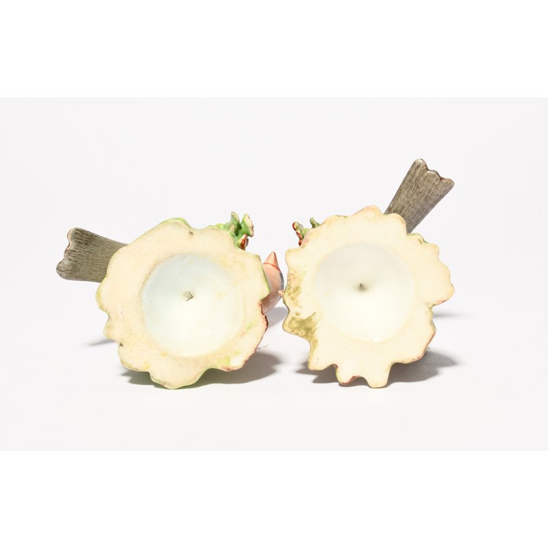 A pair of miniature Derby figures of goldfinches, c.1760-65, perched on stumps applied with flowers