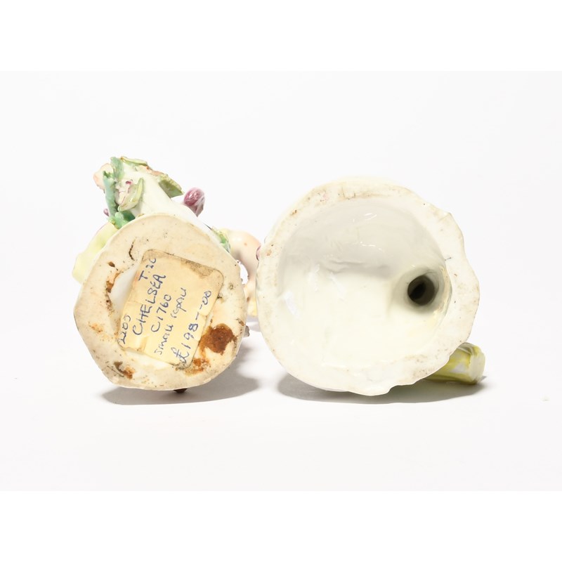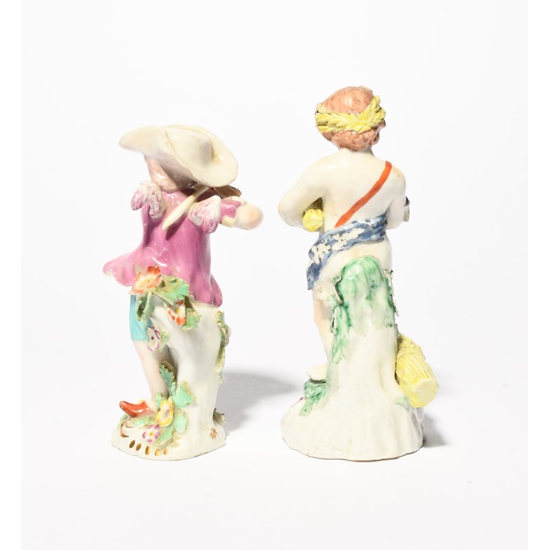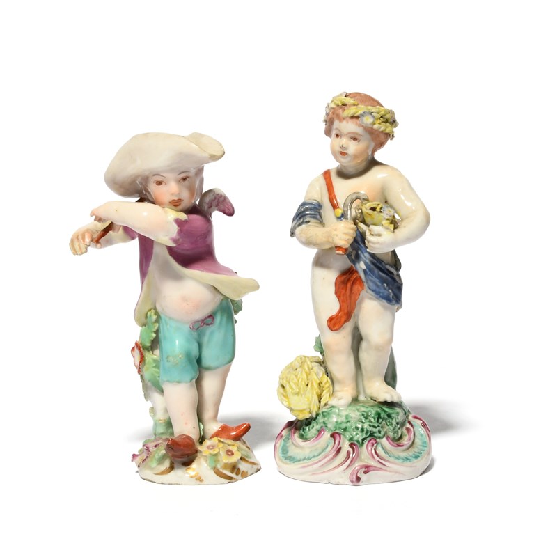 A small Plymouth figure of Summer, c.1770, modelled as a putto standing beside a sheaf of corn and holding a sickle and a further sheaf, and a Chelsea figure of Cupid in Disguise, wearing clogs and an open jacket, small repairs, 12cm max. (2)